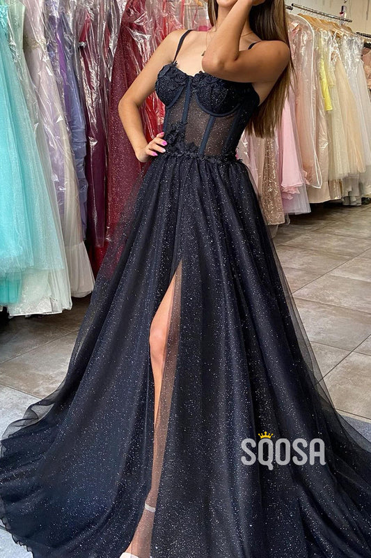 Spaghetti Straps Tulle Appliques Long Prom Dress with Slit QP3047