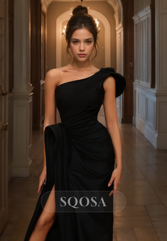 Asymmetrical Neck One-Sleeve Pleated Fitted Prom Dress Floor Length High Split Satin Formal Gowns