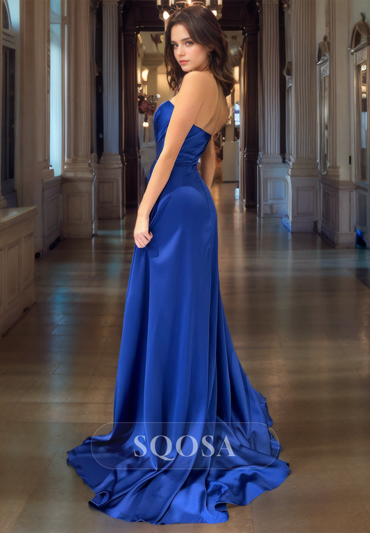 A-Line Strapless Pleated Satin Formal Dress Sleeveless High Split with Sweep Train Prom Dress