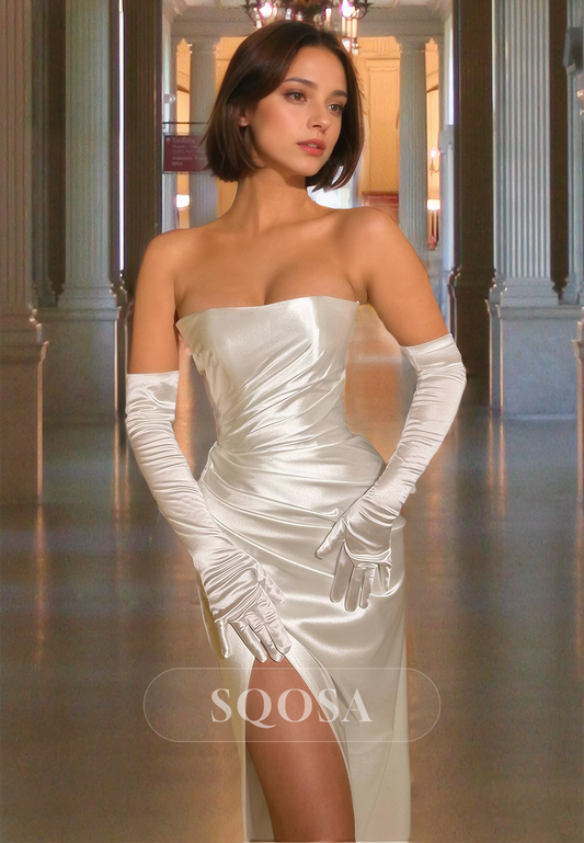 Tube Top Off-Shoulder with Gloves Fitted Prom Dress Pleated Satin High Slit Sweep Train Formal Gowns