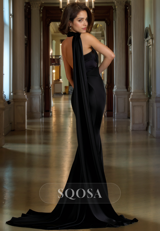 Prom Dress High Halter Sleeveless Mermaid Satin with Sweep Train for Formal Evening