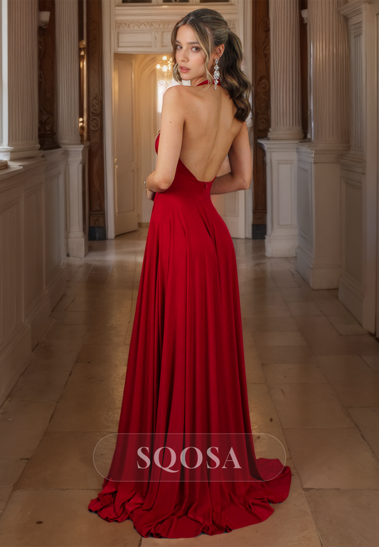 A-Line Deep V-Neck Sleeveless Pleated Satin Party Dress High Split with Train Prom Dress