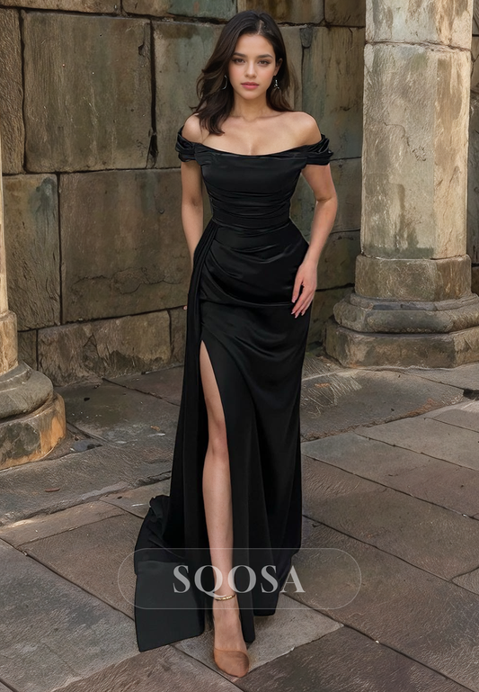 Mermaid V Neck Satin Pleats Black Prom Dress with Slit Formal Gown