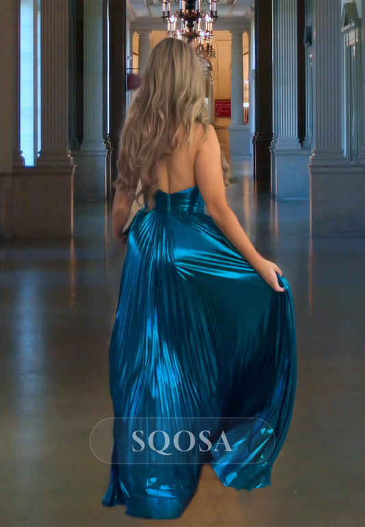Floor Length Prom Dress A-Line Sleevelss Sweetheart High Slit Evening Dress with Pleated
