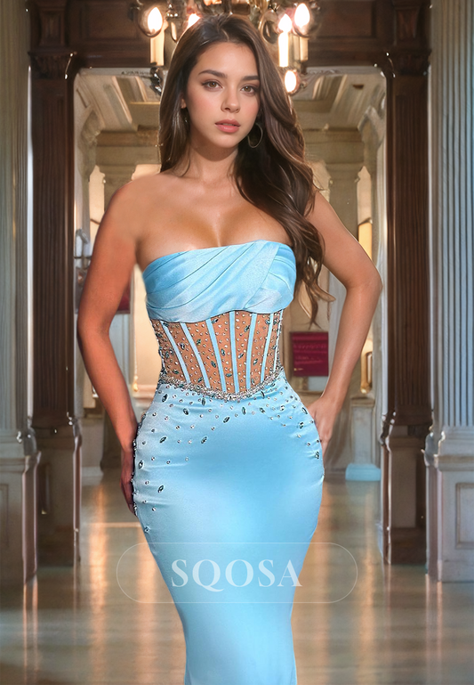 Tube Top Sleeveless Beaded Mermaid Dress Floor Length with Illusion Cutout Prom Dress
