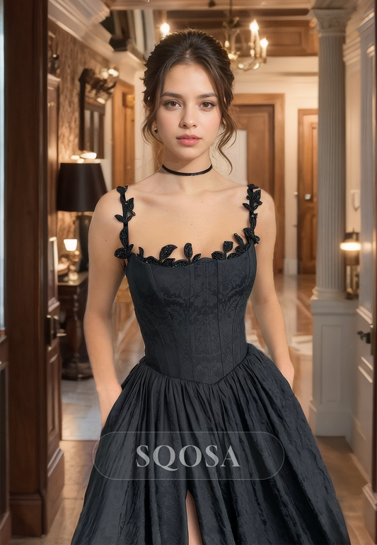 Spaghetti Straps Beads Side Slit Long Prom Dress with Train Formal Gown