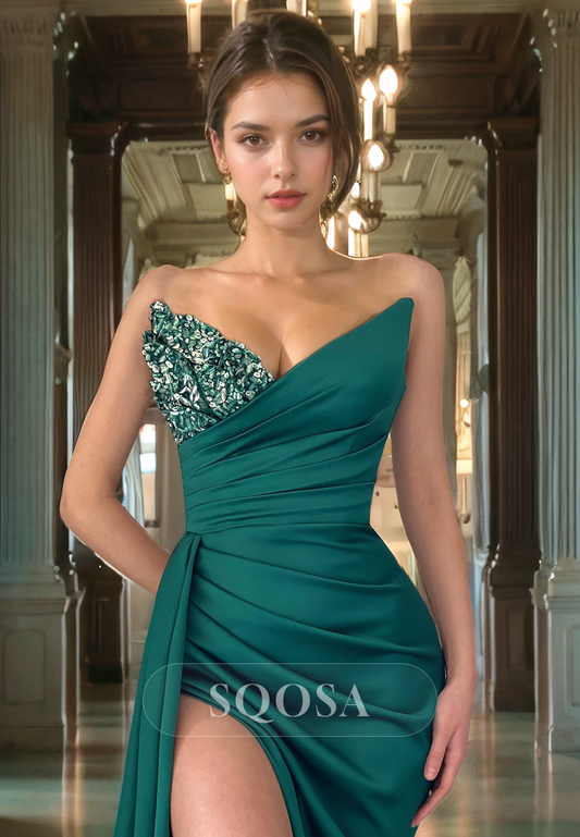 Prom Dress Mermaid Asymmetrical-Neck with Beaded Rhinestone Slit Train Party Gowns