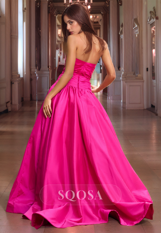 Sweetheart Strapless Satin Pleated Sleeveless High Slit Long A-Line Prom Dress