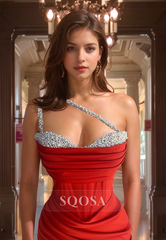 Sweetheart Sleeveless Straps Mermaid Dress Pleated Satin with Beaded Prom Dress