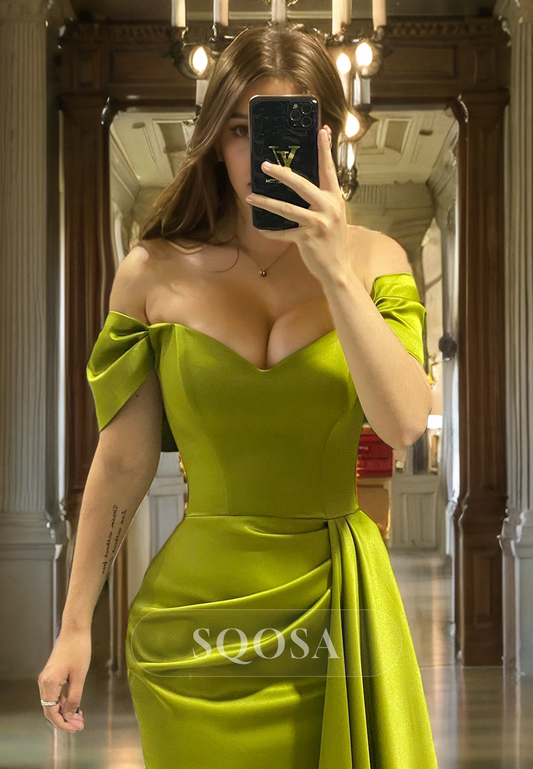 Sheath Off Shoulder Pleats Satin Long Prom Dress with Slit Formal Gown