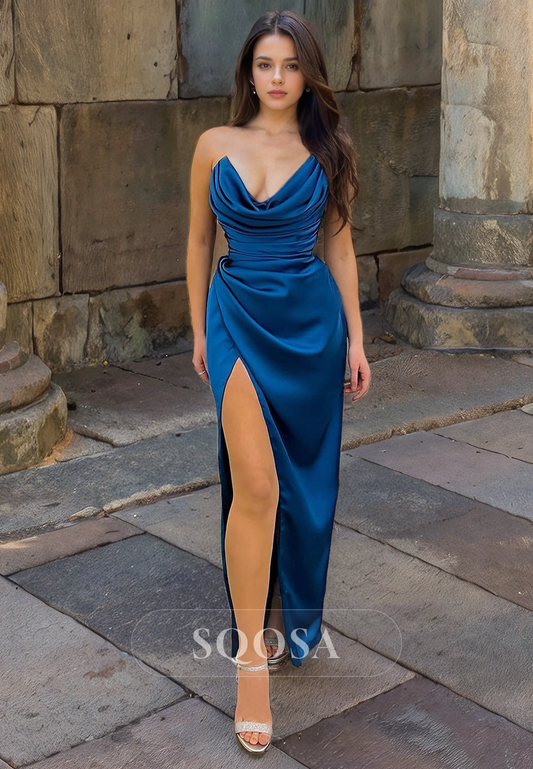Sheath Strapless Satin Ruched Long Prom Dress with Slit Formal Gown