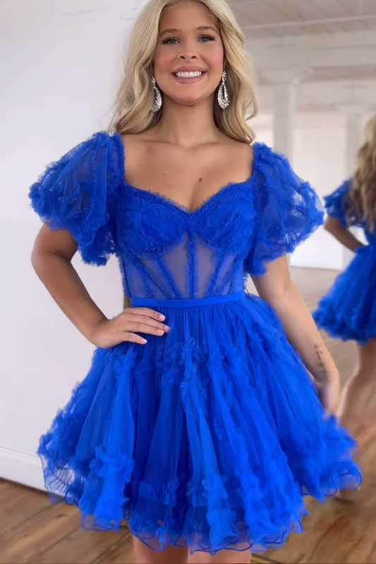 A line Deep V neck Tulle Ruffles Short Homecoming Graduation Dress QH2340