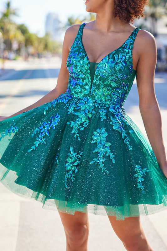 A line V Neck Lace Appliques Short Homecoming Graduation Dress QH2337