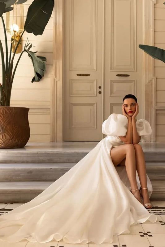 A-Line Tube Top Off-Shoulder Puff-Sleeves Pleated Applique Chiffon Wedding Dress with Sweep Train