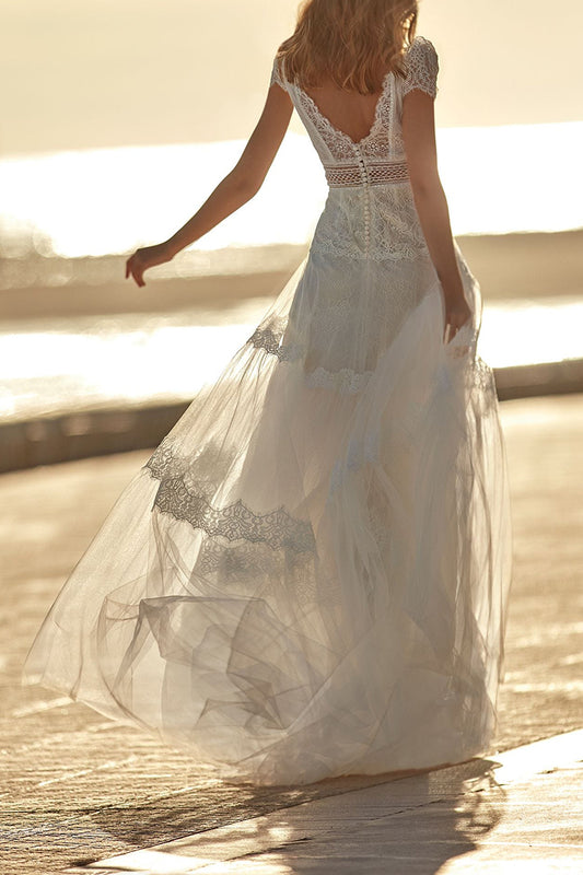 A Line V Neck Short Sleeves Lace Boho Wedding Dress with Train