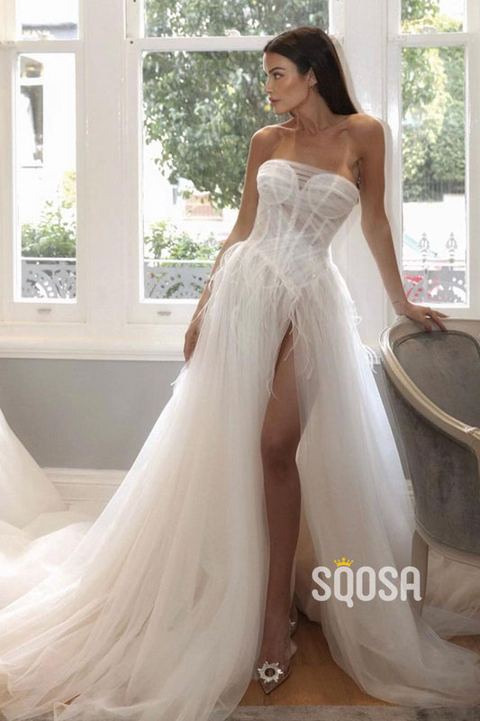 A-line Illusion Feathers High Split Bohemian Wedding Dress QW2375