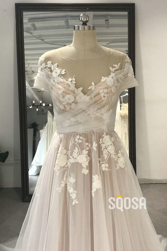 A-line Lace Top Short Sleeves Champagne Wedding Dress Bridal Gown QW2152