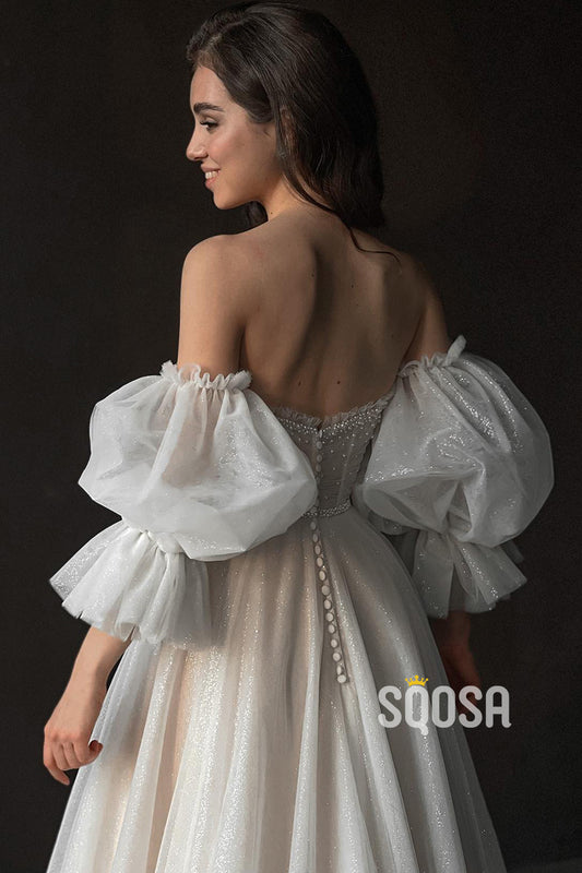 A Line Sweetheart Short Sleeves Sparkly Boho Wedding Dress QW0829
