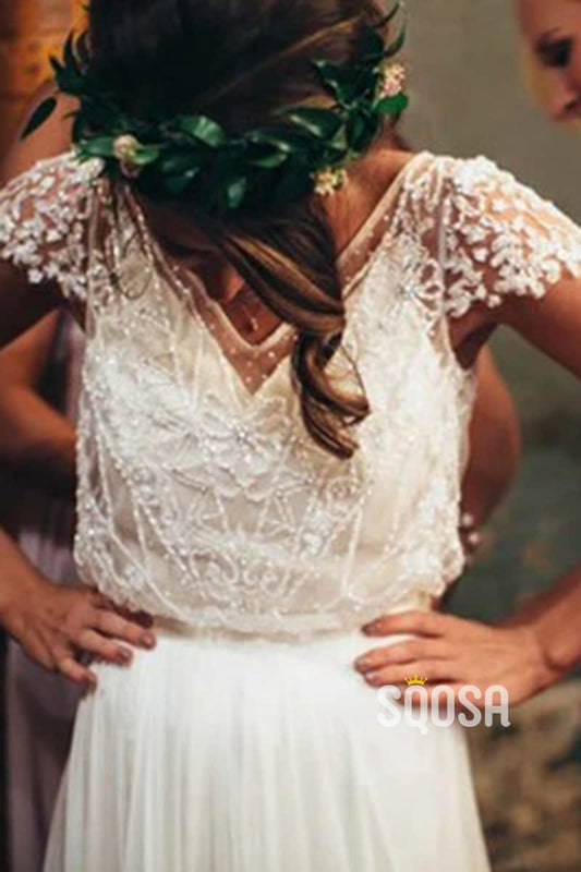 A-line V-neck Short Sleeves Beaded Rustic Wedding Dress QW2417
