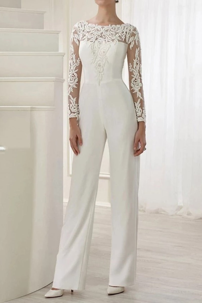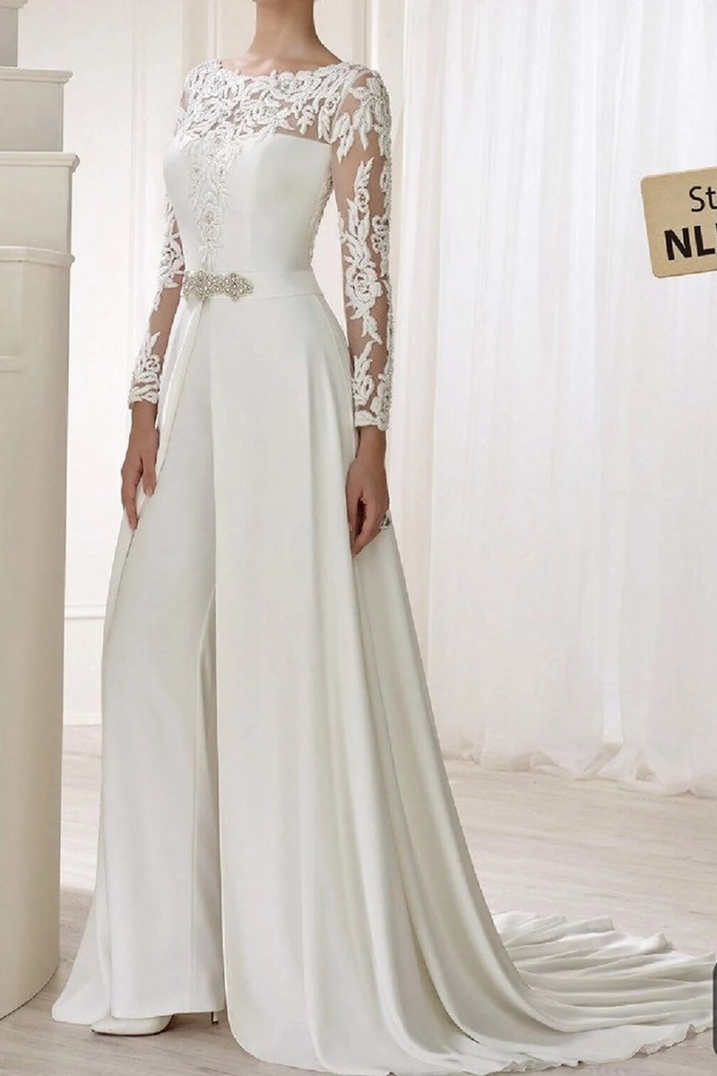 Hall Casual Wedding Dresses Jumpsuits Long Sleeves Illusion Neckline With Sashes / Ribbons Crystals 2023 Bridal Gowns QW2397 x 1;