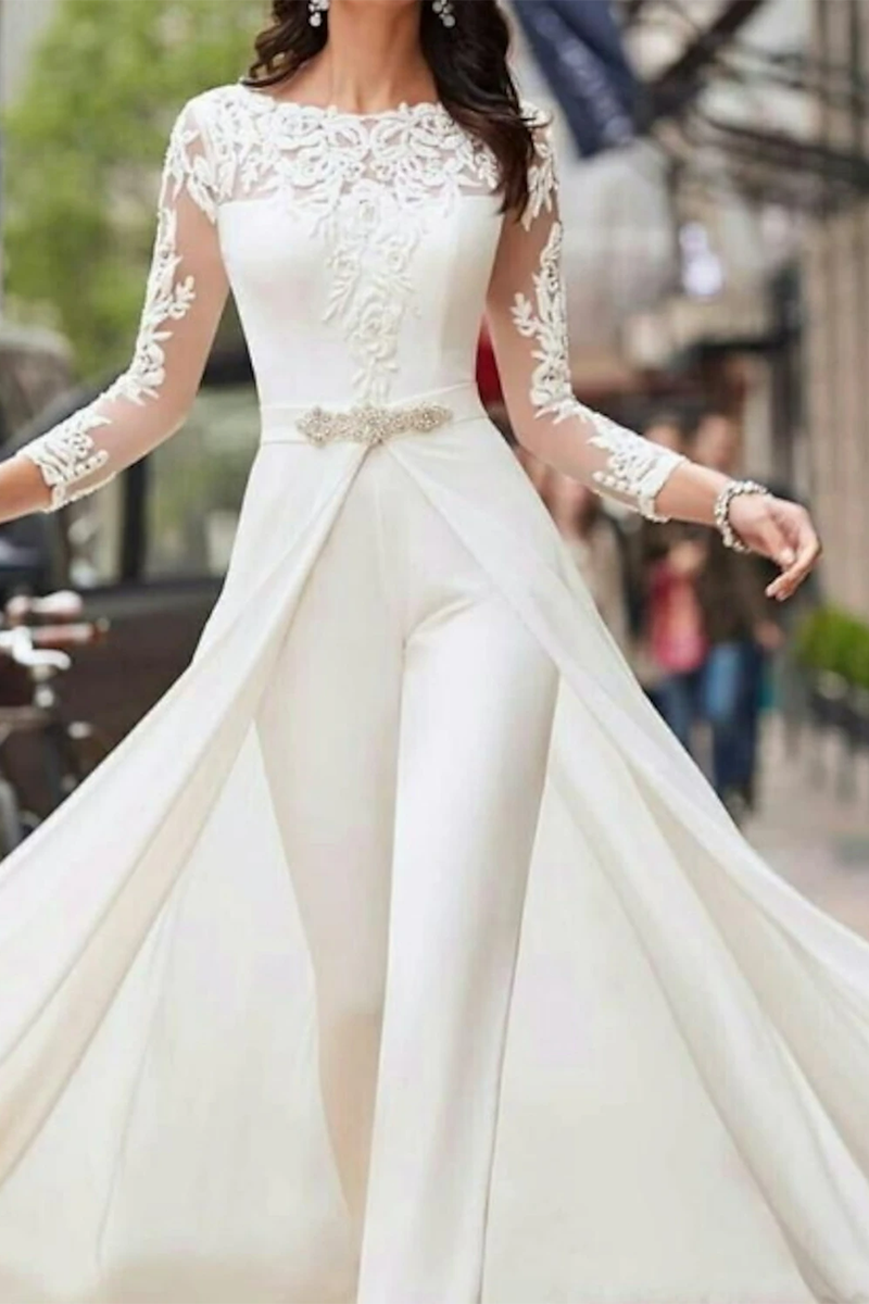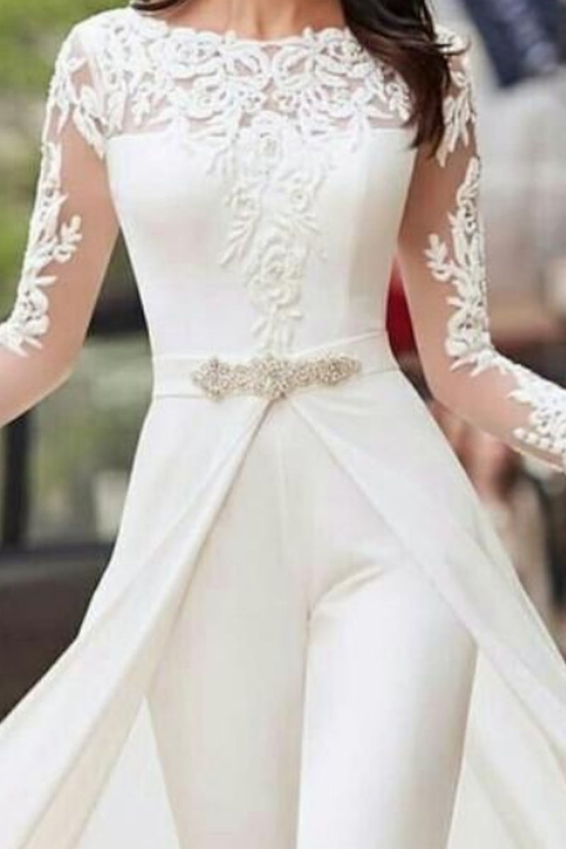 ual Wedding Dresses Jumpsuits Long Sleeves Illusion Neckline With Sashes / Ribbons Crystals 2023 Bridal Gowns